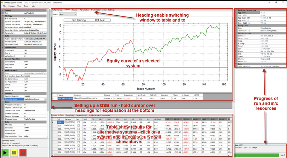 To start, open GSBManager or GSBStandalone by double clicking on the icon on your desktop. The layout is shown in FIG 1.21 with some note to explain the various windows and buttons. This gives some idea of the layout. Take a good look and hold your cursor over headings in the table center low window for explanations and move the window along to see performance results for the training and out-of-sample periods (OOS).
