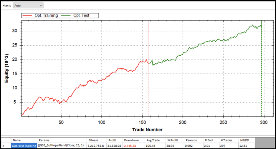 By scrolling the table to the right can check out the performance parameters on both the Training and Testing periods. You can see some performance data in training (red headings) and testing (green headings) in FIG 1.62. The easiest way to assess the robustness of a trading system is to look at the Equity Curve. This is shown in FIG 1.63 for the first selected AAPL system (system labelled 1 in FIG 1.61). The equity curve climbs steadily with quite small drawdowns over both training and testing.