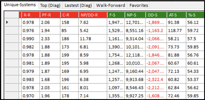 We also looked at NP/DD-F which is Net Profit/Drawdown (Closed Trades) – Full Period. I then looked for a balance between total profit (NP-F), win percentage (%-F), number of trade (C-F), size of trade (AT-F) and profit factor (PF-F).