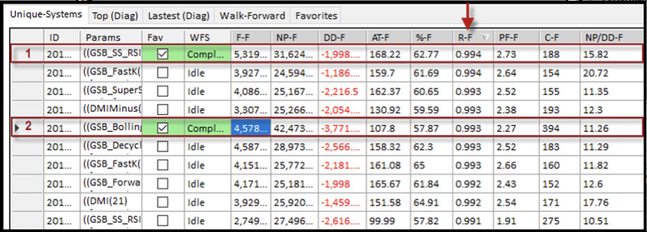 When its finished we find that GSB has developed a considerable number (Closed to what we decided) of trading system. We now need to find a trading system with good balanced performance over both the training and test data. You can click on the headings of each row in the window part of which is shown in FIG 1.61 to order/sort the systems for that particular parameter. What I have done with these systems is to order from highest to lowest P-F which is Pearson – Full Period by clicking on the P-F heading – indicated by the red arrow. This is the Pearson Coefficient which measures how close the full equity curve for both training and testing (in-sample and out-of-sample) periods is to a straight line (a straight line has a value of 1.0). The highest value in FIG 1.61 is 0.994 and there are a number at 0.991 and above in the limited number of system results shown 0.990.