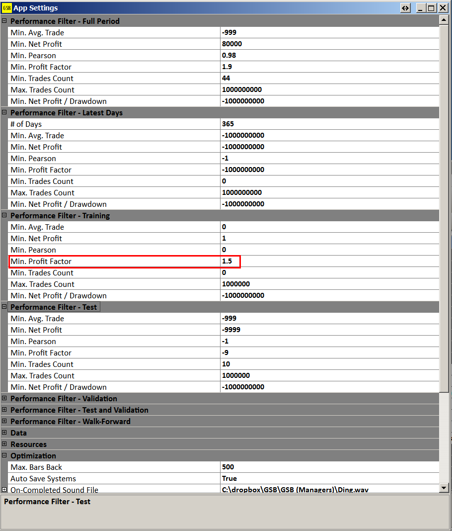 It is recommend to start using GSB with profit factor 1.2 in the training period, and allow all other systems (good and bad) to pass. This will mean you get a real picture of what works out of sample, and the ratio of good and bad systems out of sample. For markets that GSB finds it easy to make systems on, IE S&P 500, increasing this to a higher value of 1.5 to 1.8  is good to do. If the PF value is too high, no systems might be produced.