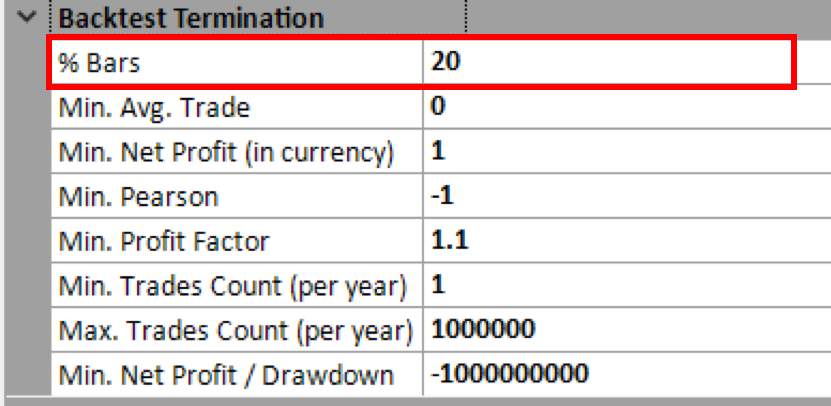 Terminate Strategy's backtest (During Optimization or Walk-Forward) after % bars (of the full period) if performance does not pass the specified criteria. It is mainly used to increase optimization speed.
