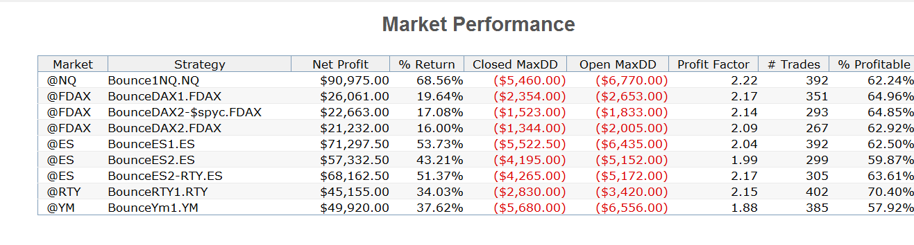 Bounce can trade futures on S&P 500, Nasdaq, Dow, Russell 2000 & Dax, and there are a few variants of Bounce on S&P500 and Dax market.