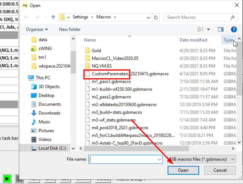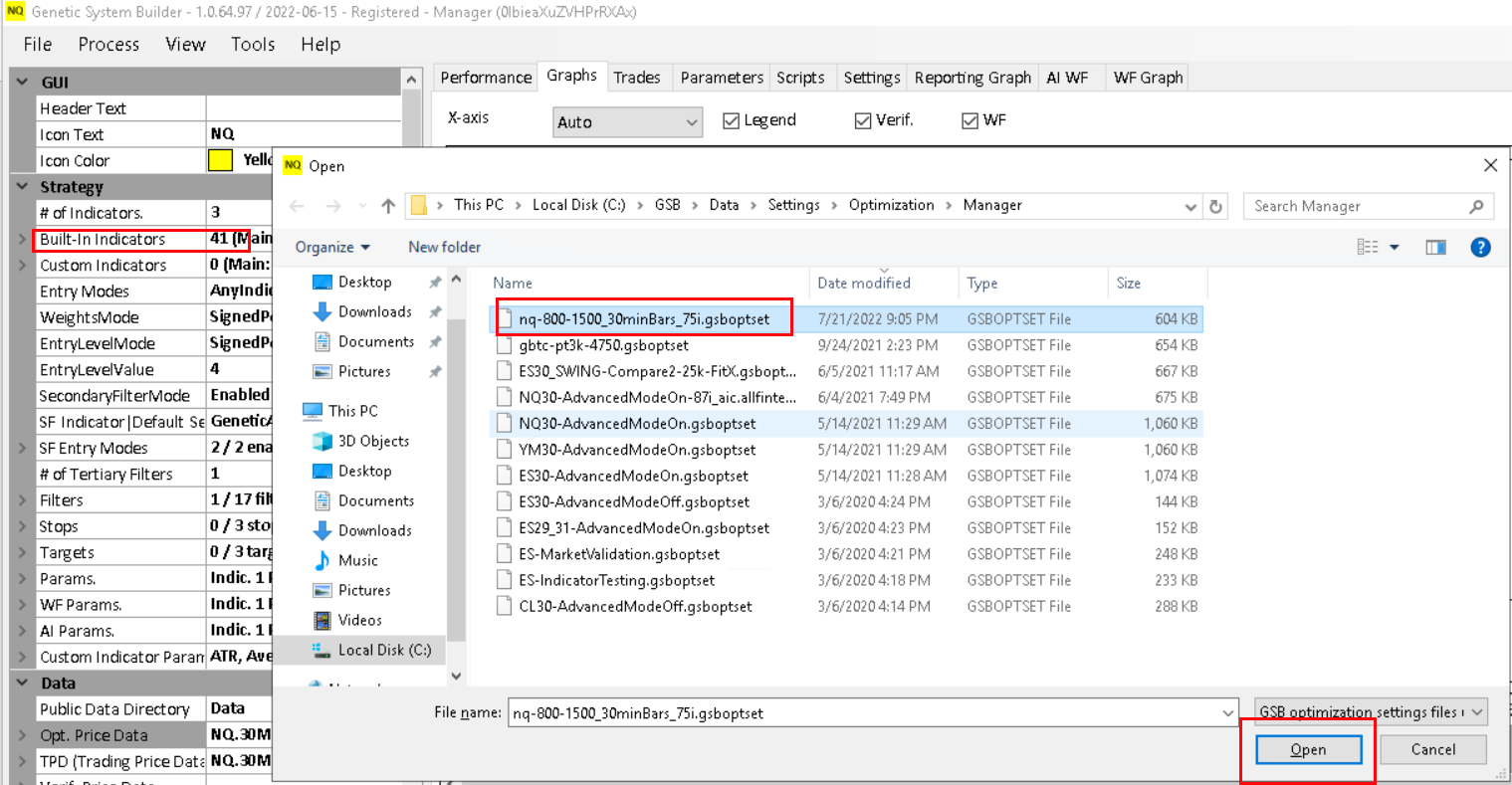 (Name in cyan is not correct. It will be nq-800-1500_30minBars_75i_GReen.gsboptset.