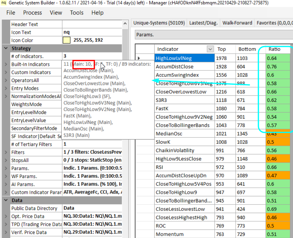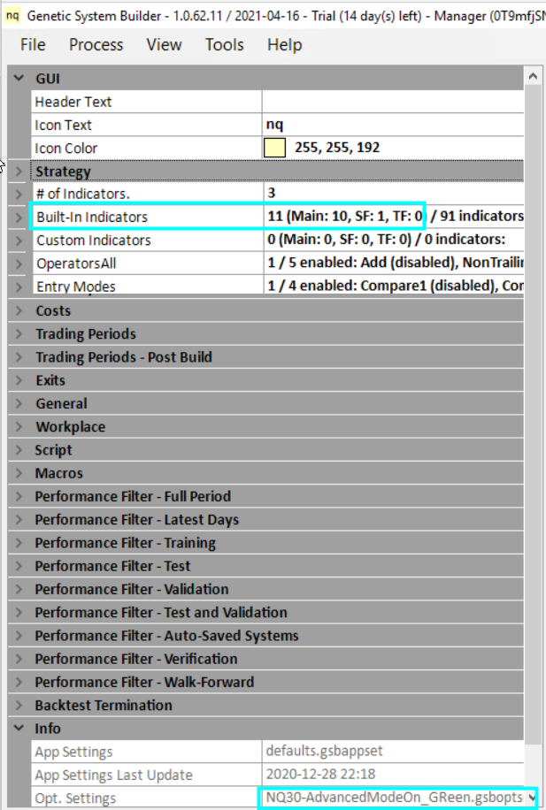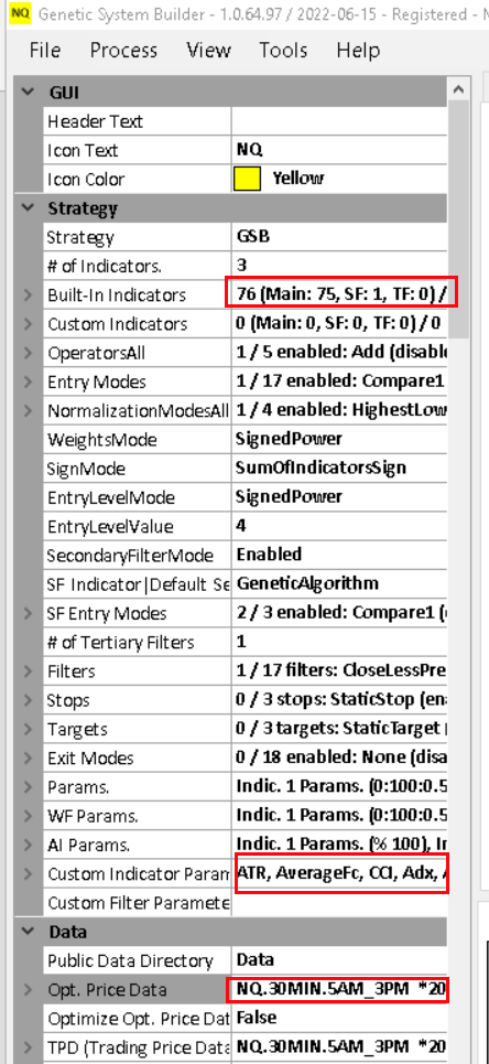 Note below the new manager has the 10 indicators selected, and the file opened was nq-800-1500_30minBars_75i_GReen.gsboptset