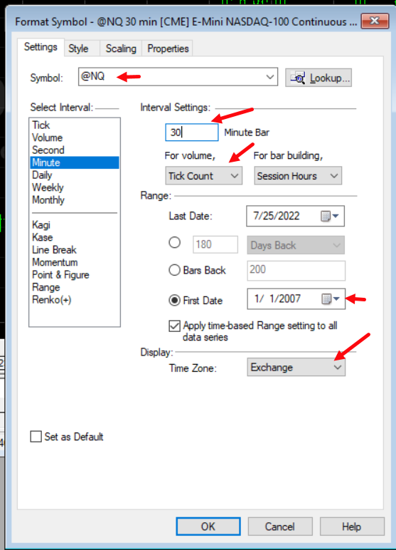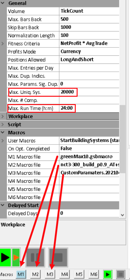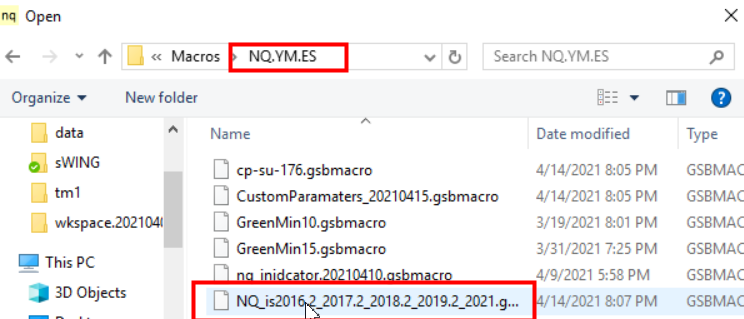 The macro will also have save these new settings as nq-800-1500_30minBars_75i_GReen.gsboptset. Note that _Green was appended to the existing file name by the GSB macro.