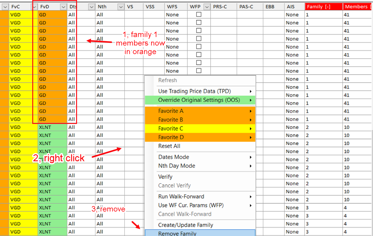 Below is an example (From a completely different setup) that shows a bad family 3. 4 of the members in family 3 had really poor performance. 1 member was also not good with net profit $10760 and draw-down $7970