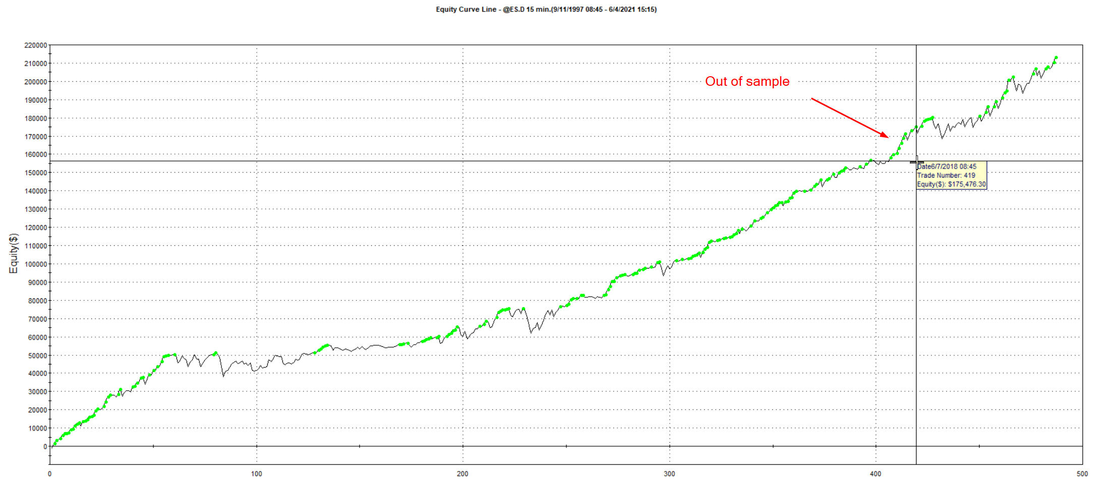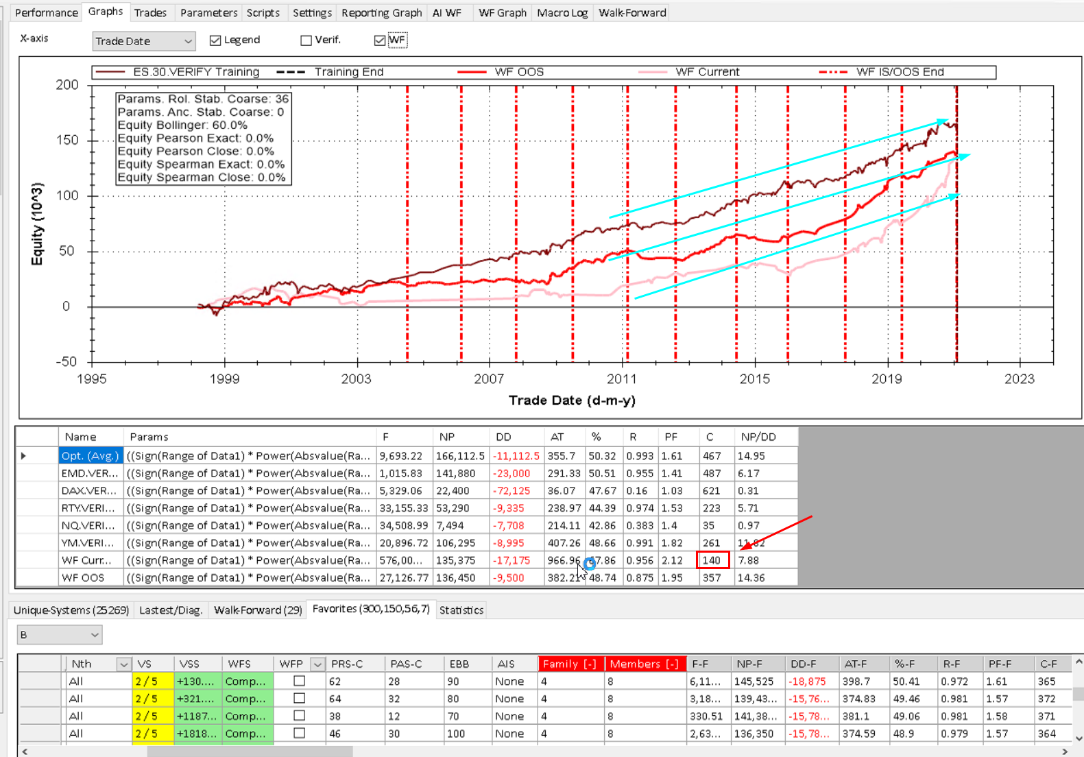 The average walk-forward out of sample was $203867.5 (zero slippage). This is a WF of all members of the same family. (A family is the identical system, but with different parameters)