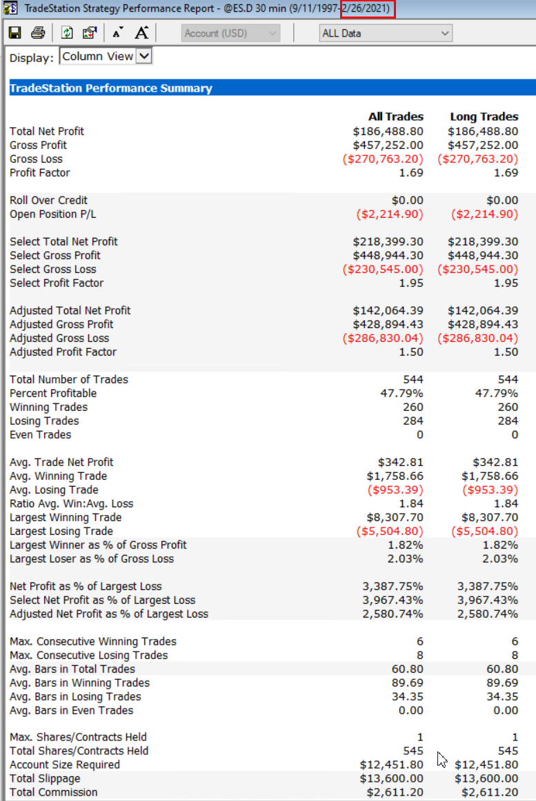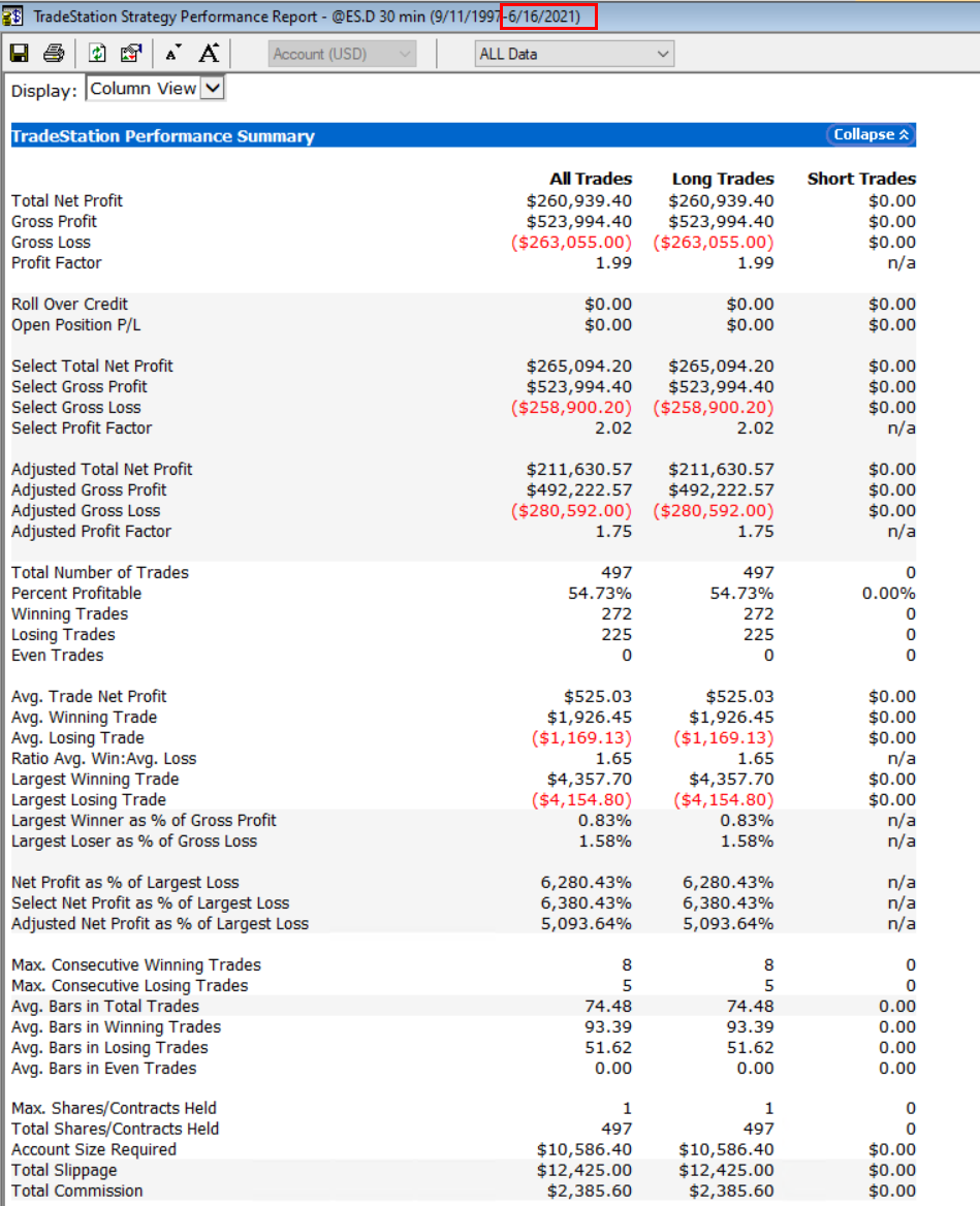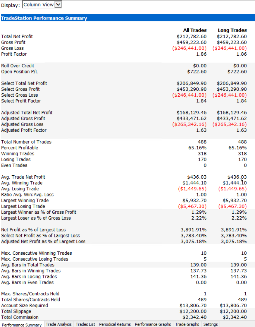 I also recommend NOT to optimize the stop and profit target in TS. This can be left as $4000 stop and $2750 P.T., or you can optimize this when the system is finished.