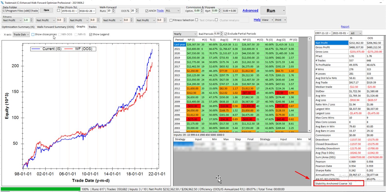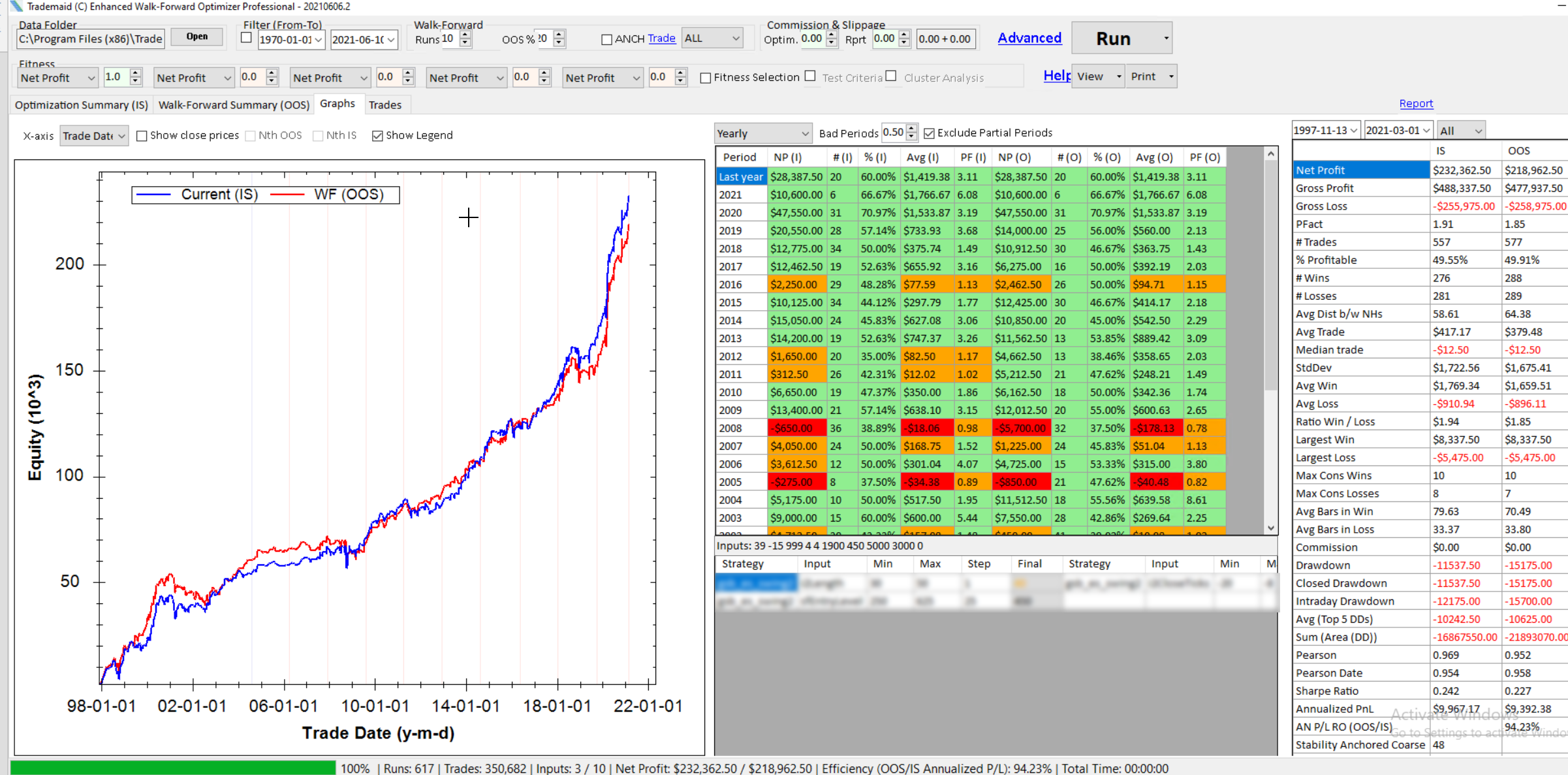Normally I would have liked higher anchored (my strongest preference) and higher rolling WF stability numbers, but chosen the system on the basis of good out of sample results,