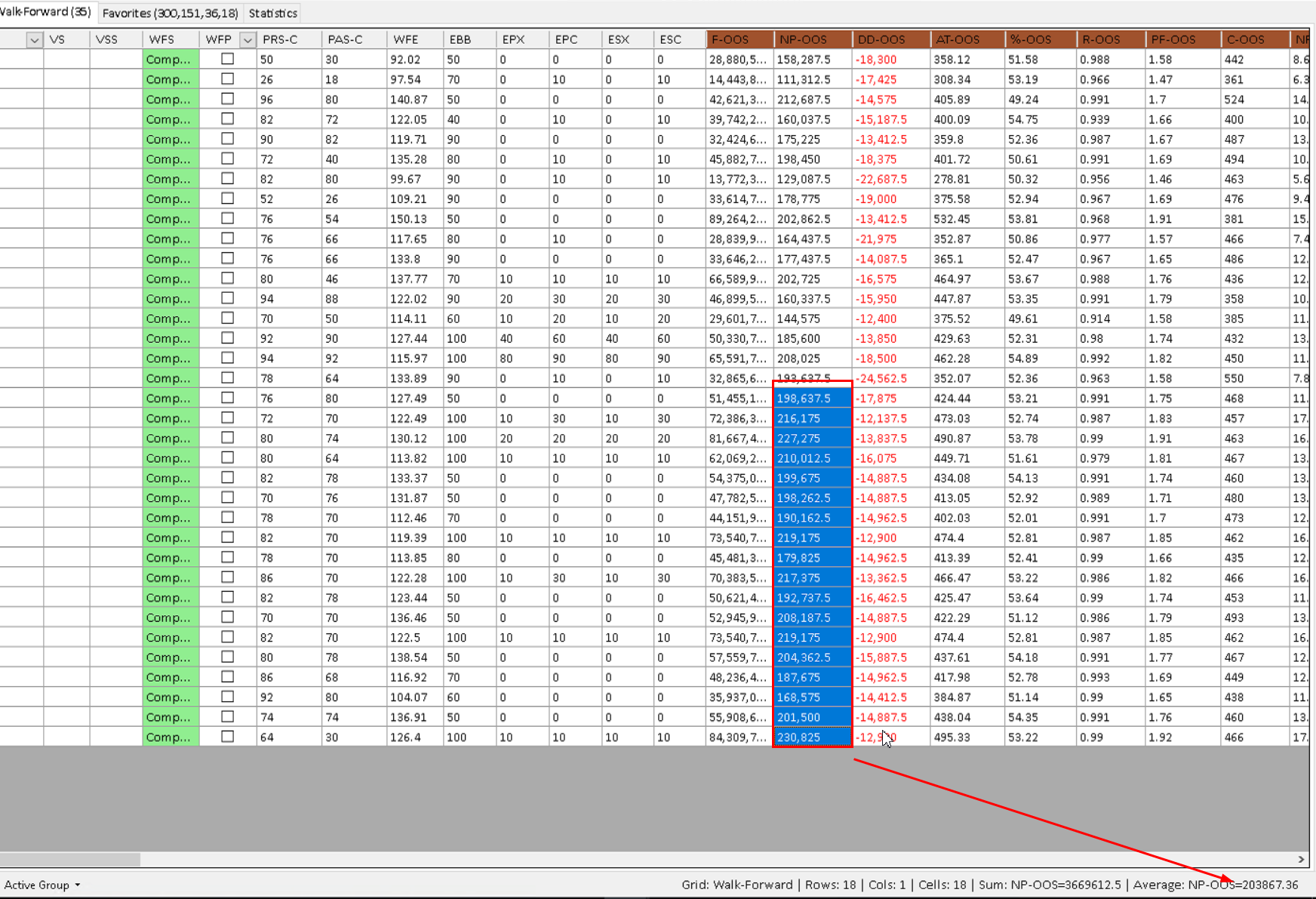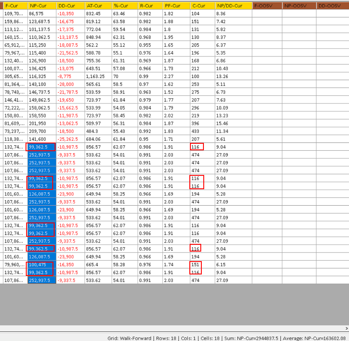average is $163602. Why this is down is numerous wf final parameters give very few trades. I suspect this is due to the fitness used to do the WF.