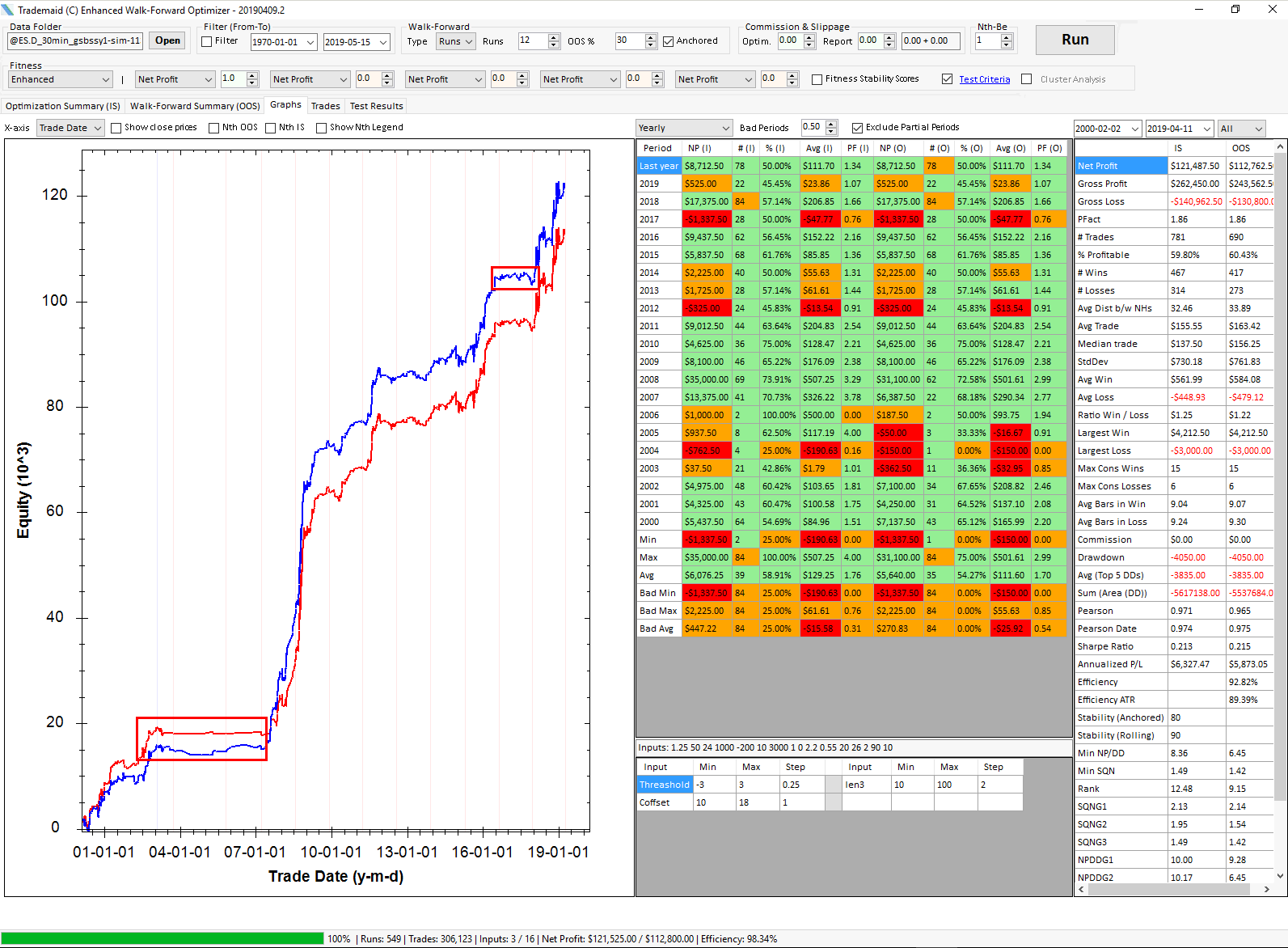 2) Walk forward efficiency should be >60. See efficiency to see how this is calculated.