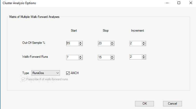 The amount out of sample % and number of runs can be set here. Also anchored and rolling can be chosen.