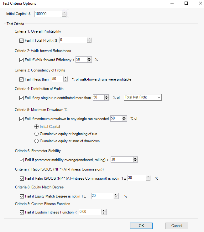 5) Fail if maximum draw-down of any run > 25% of initial capital. You may need to adjust the initial capital figure to be appropriate to the position size and contract used.