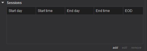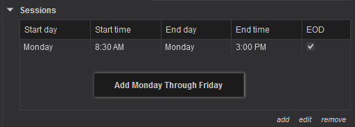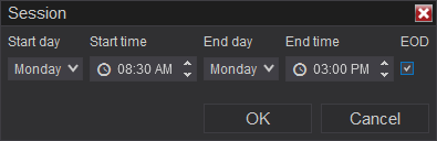 In the Session dialog box set the Start day and End day to Monday, Start time to 08:30 AM and End time to 03:00 PM. Left click to tick the End of Day (EOD) check box.