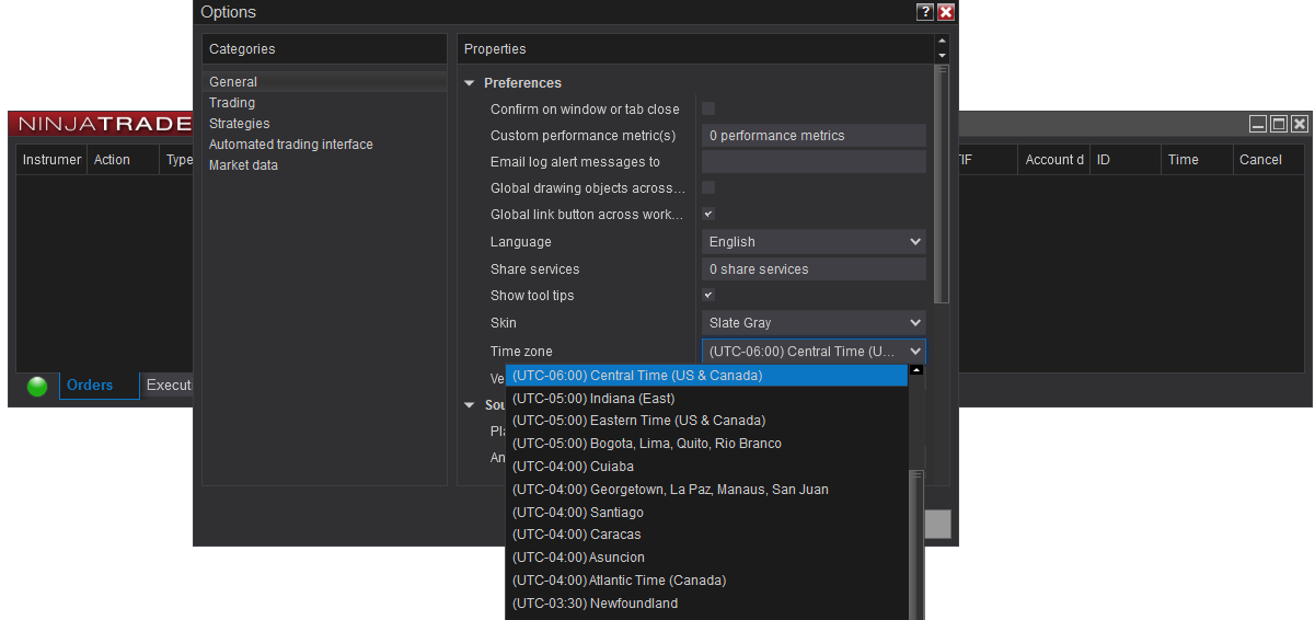 To achieve the highest compatibility between GSB, Tradestation and NinjaTrader, they all need to operating off the same time zone. For consistency between trading platforms, we can set NinjaTrader to use US Central Time like we do for Tradestation. There is no need to change the PC local time to do this however, it can be configured within NinjaTrader.