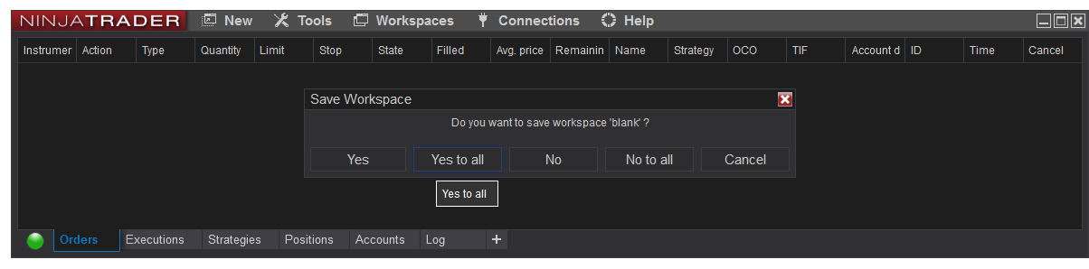 If asked to Save the Workspace, and you are unsure about which option to select, left click Yes to all.