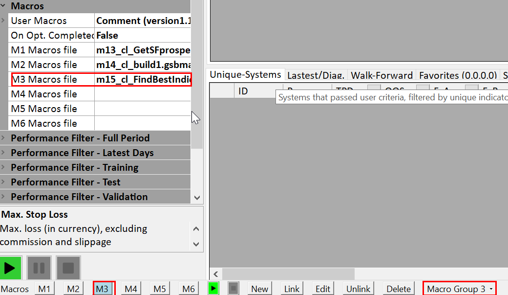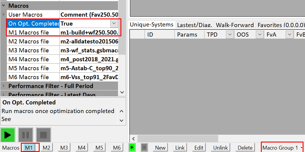 Otherwise run macro1 (group1) to select the top 250, and to walk forward them once 50,000 systems have been made.