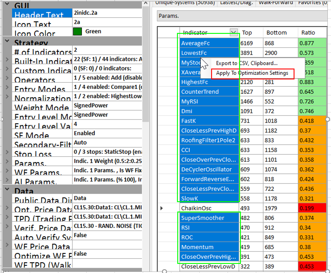 build 50,000 systems and do stats. Put green indicators into primary filters. Note we are using 2 indicators. This is a lot faster than 1 indicator as its easier to build a system with 2 indicators,rather than 1 indicator.