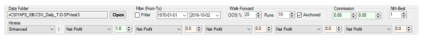 The left commission field: This one is used within the walk-forward calculation only. It has no direct impact on the reported performance figures, but an indirect one. During the walk-forward process this commission amount is deducted for every trade. Thus it influences the best combination of input values. This commission has no affect on the reported figures: the left commission field has no impact on the reported average trade.
