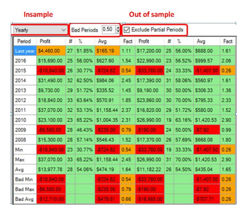 - Bad Periods: (Min,Max,average) This is the results of the bad years that are 50% or worse the average of the other years.