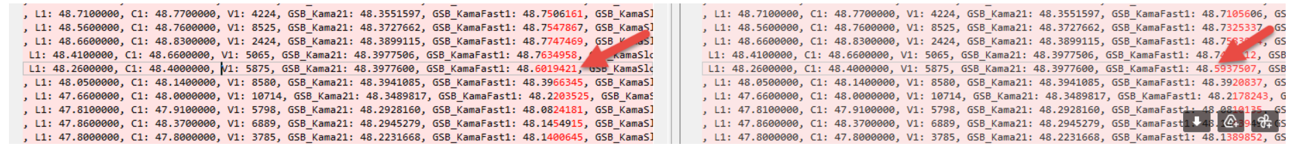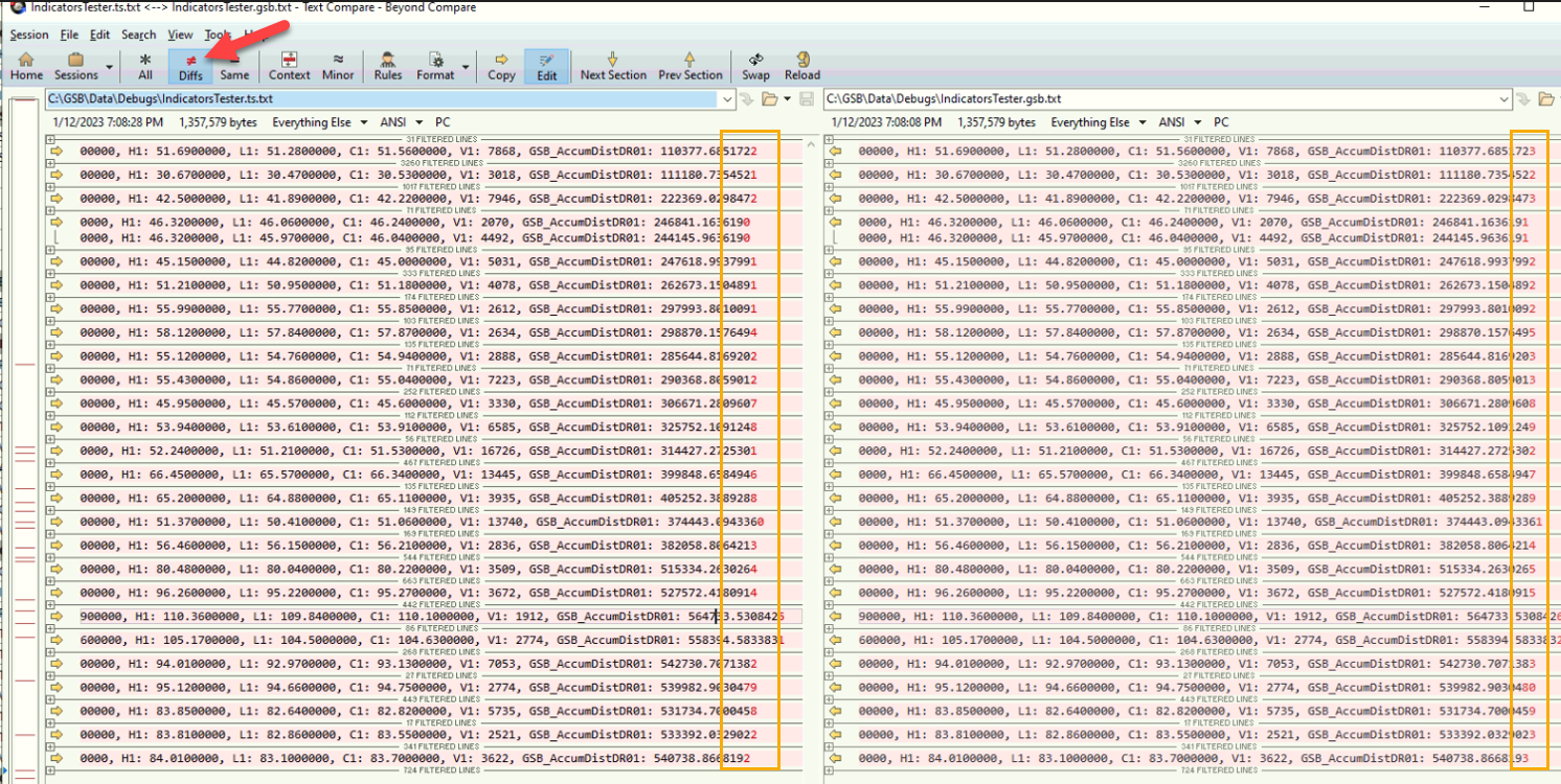Differences in the first line of the files can be ignore. It can take sometime for indicators to get in sync.