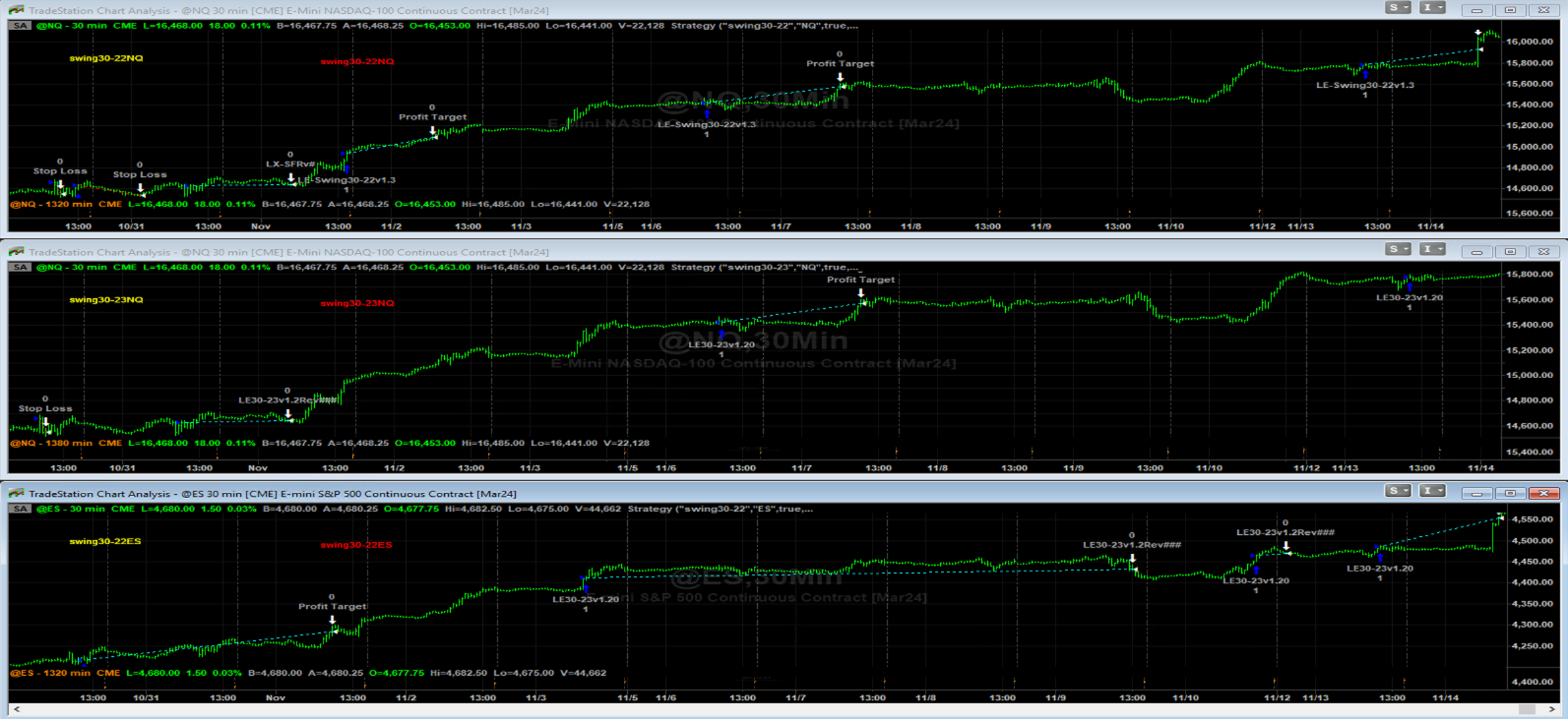 The differences in results between the 3 systems are due to mild parameter / code changes, and 23 hour vs 22 hour a day session, and 2 Nasdaq systems compared to1 S&P 500 system.