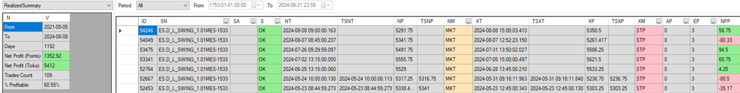 Results for Emini contracts shown, but most users will want to trade on micro contracts. (1/10 the size)