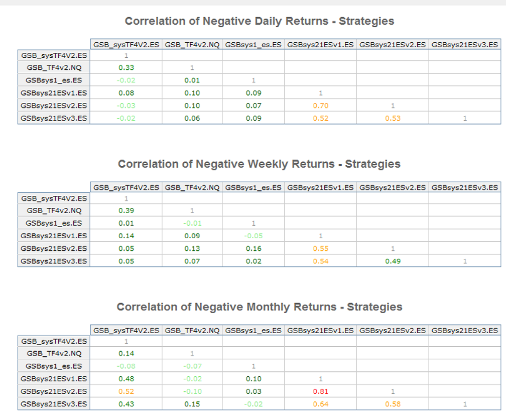 Correlation figures to the only other day trading system for sale are excellent, but note that the 3 variants of GSBsys21.xES are highly correlated.