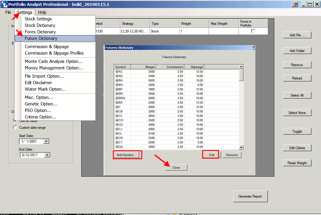 Add the required slippage and commission (per side) , and contracts if they are not in the list.