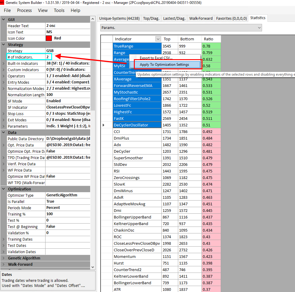 This is best using 2 indicators, and ideally 40,000 systems to get consistent results. Less works but will not be as accurate.