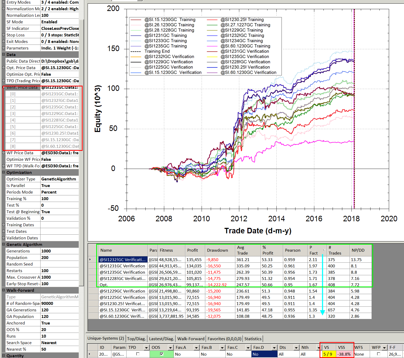An important note, post 6/30/2015 out of sample results improved greatly after the WF, but we did a WF with nth set to all, not no trade. This means we have chosen systems that gave good results with a fairly small in sample to out of sample ratio. This confirms (though is not full proof) that they are valid systems. Then we have WF the systems, but now have a greater In sample ratio as we are no longer skipping every second group of 80 days. This gives us a more accurate view of the parameter settings that work much better post 6/30/2015.