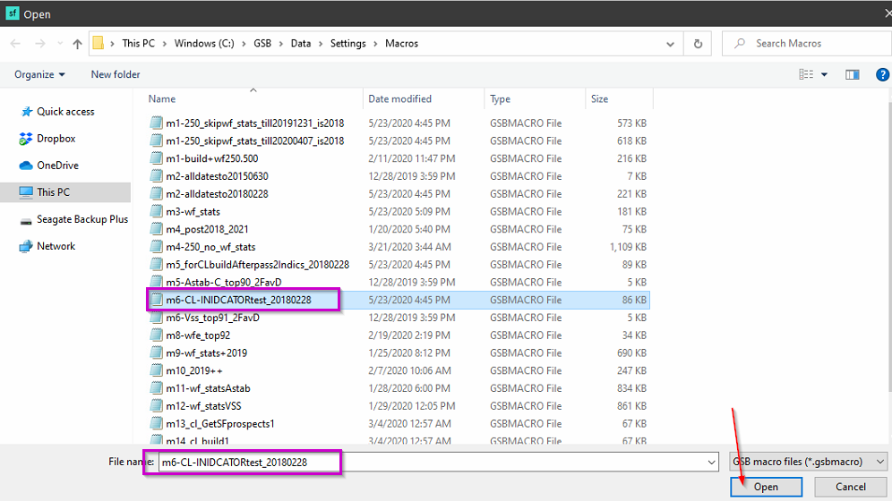 This displays a list of macros in the default macros folder. Select the m6-CL-INIDCATORtest_20180228.gsbmacro file and click Open
