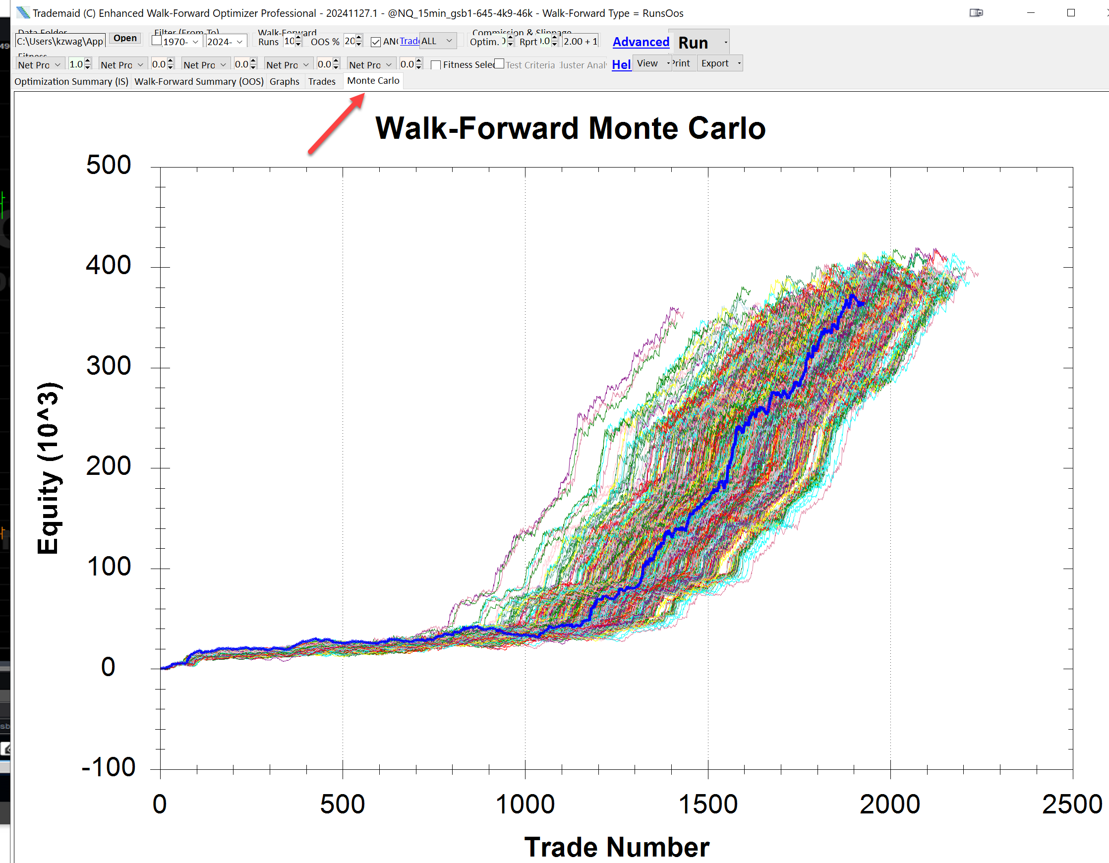 The graph is unusual and a superb example where most WF gave superior results to the final thick blue equity curve.