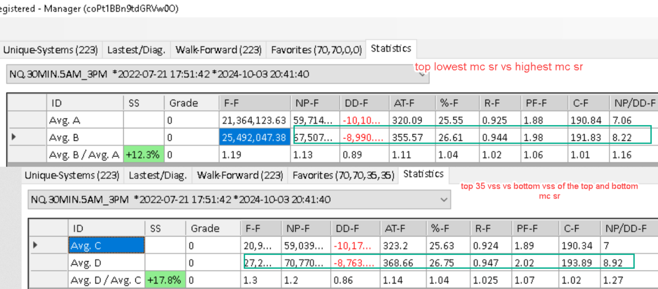 top 70 MCSR vs bottom 70 MCSR using 250 iterations, anchored walk forward, then take the worst 35 VSS of the bottom 70 systems and compare to the best 35 VSS systems of the top 70 wf systems