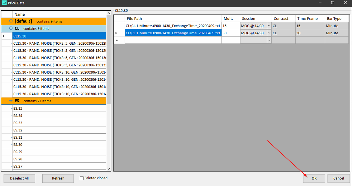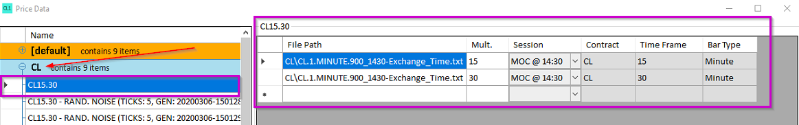 When the Price data selection window displays we click the CL symbol on the left and select CL15.30 as shown below.
