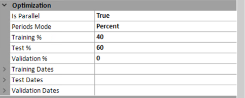 A typical default is to use 40% training and 60% test. Any dates excluded in GSB left menu will also be excluded.