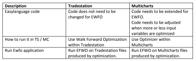 Enhanced Walk Forward Optimizer for Tradestation & MultiCharts Overview: differences between Tradestation & Multicharts The two implementations are different. Here are the differences using EWFO with Tradestation or with Multicharts: GSB can also write files for EWFO.
