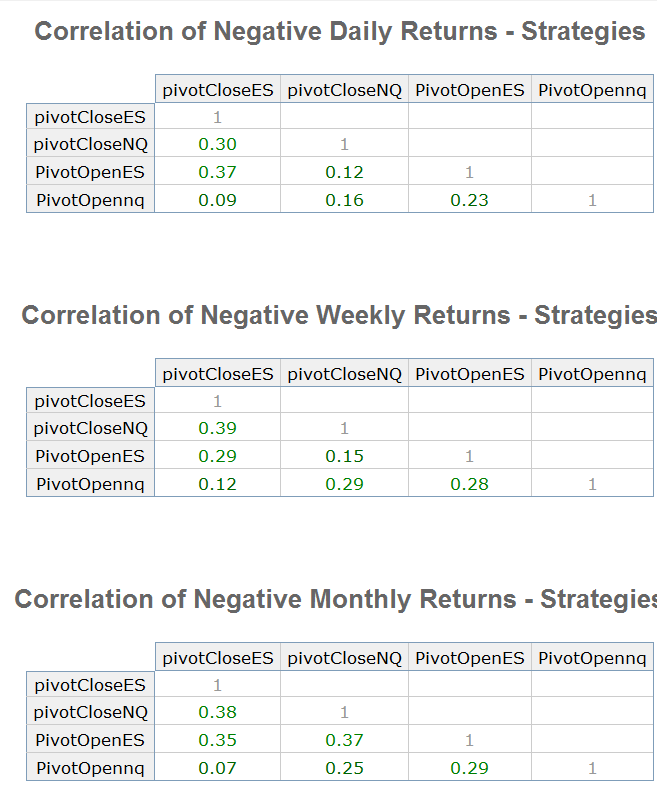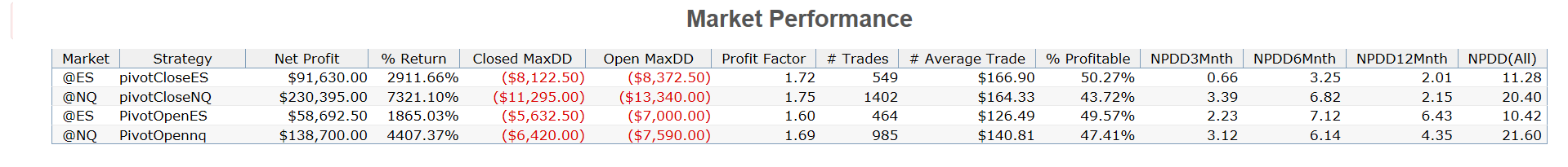 The Pivot ES/NQ systems are long only. There are 2 variants for each market. Pivots using Open and Pivots using Close. Results of each vary significantly.