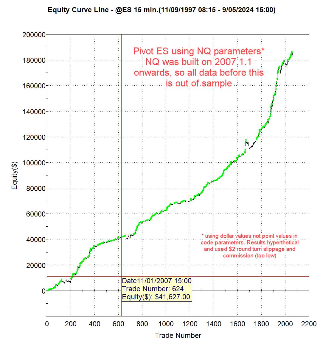 This system quickly gained my attention when I saw the NQ system built 2007 on-wards, put on S&P 500 data from 1997 on-wards. The 1997 to 2007 results were excellent.