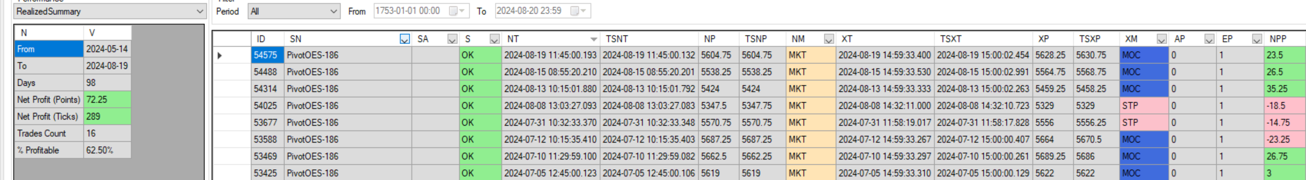 Real time results May 10 2024 to August 19 2024 = 119.25 points $5962.50 less brokerage.
