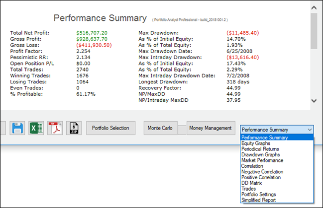 - Drawdown Graphs – Shows the Drawdown in the Graph. It has Daily Drawdown, Daily Net Profit & Drawdown, Closed trade Drawdown, Intraday Drawdown, Drawdown Depth Distribution, Drawdown Length Distribution, Closed Trade Drawdown of Each System, Intraday Trade Drawdown of each System, Contribution of Each system to Max Drawdowns, Contribution of Each System to Average 5 Worst Drawdowns