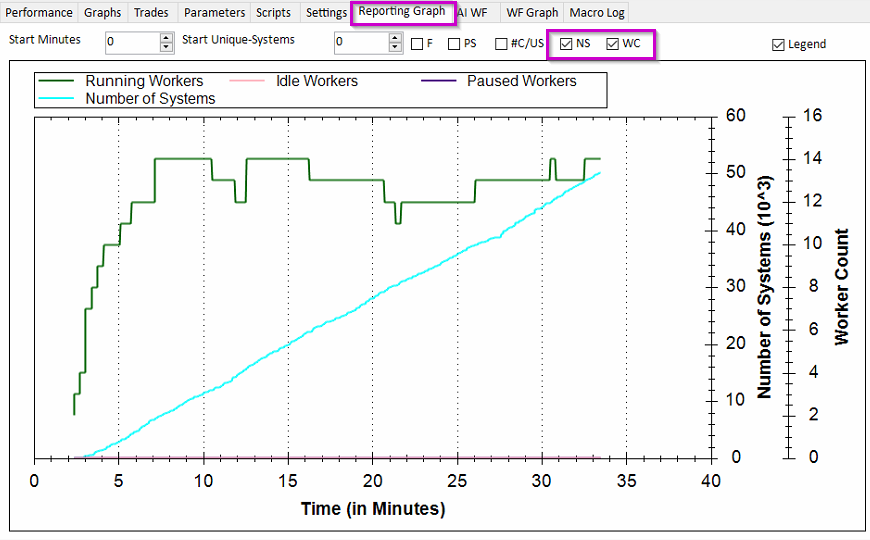 You can monitor the progress by looking at the Reporting Graph tab and selecting NS (number of systems) and WC (worker count)