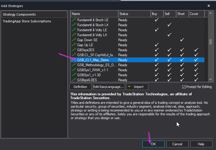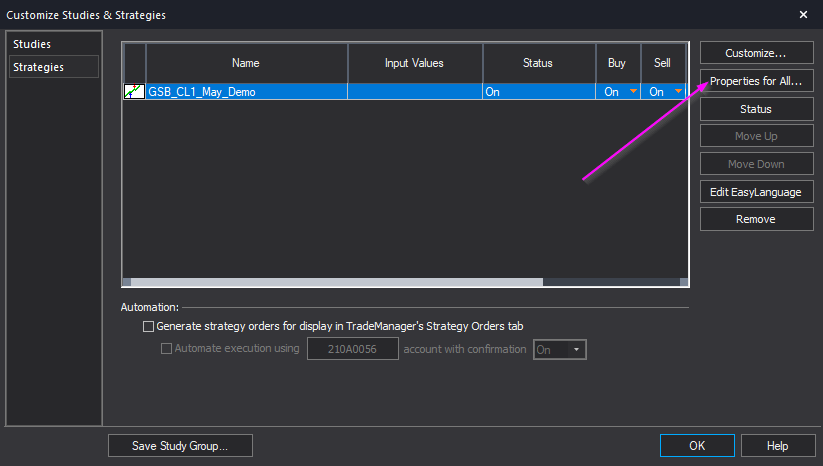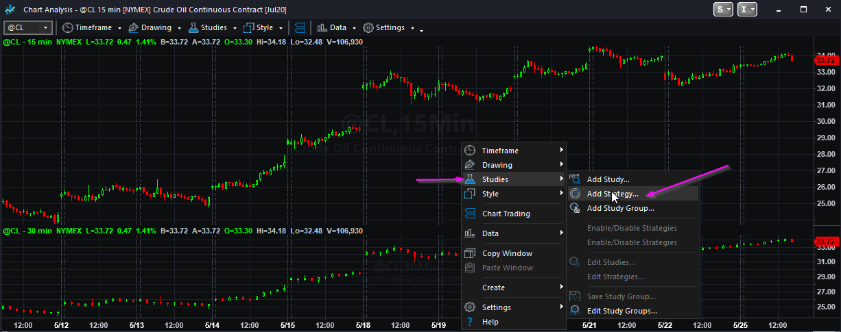 We now add the strategy to the chart by right clicking on the chart, click Studies and Add Strategy...