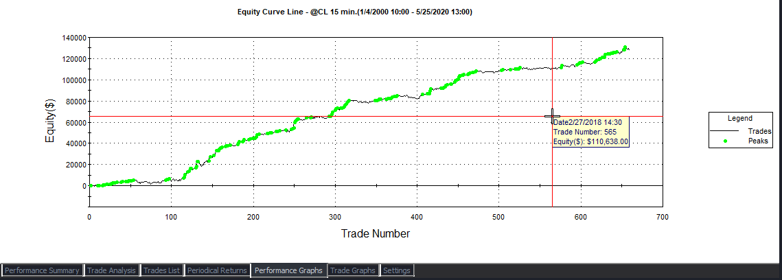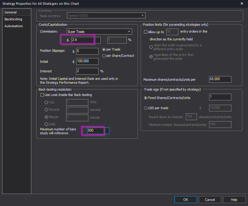 Set the commission to $2.40 per trade and the Max number of bars to reference to 500