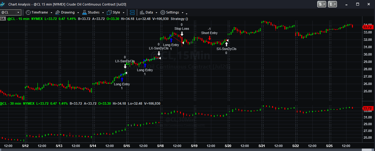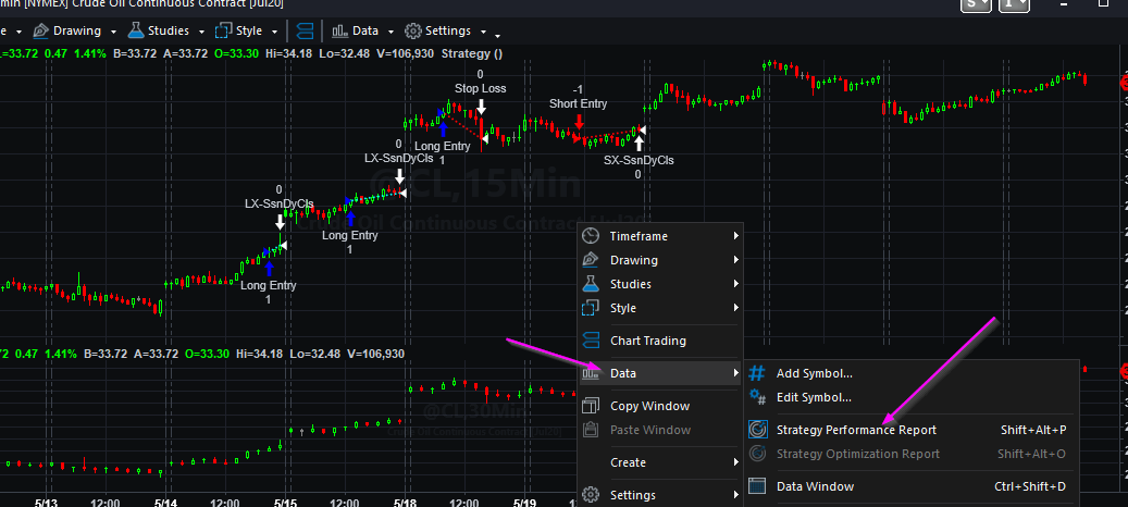 You can then view the strategies performance by right clicking on the chart, select Data then Strategy Performance Report