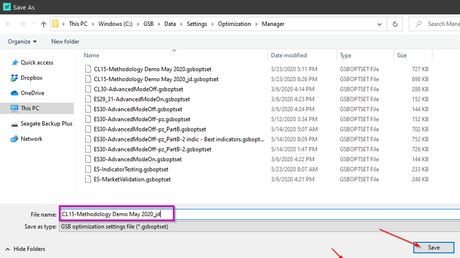 Let's now save these settings so that if we come back to this later we can simply load the optimization settings.