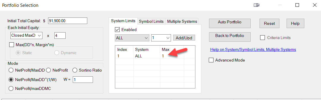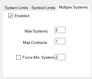System limits make the max number of contracts a individual system can have. This also speeds up portfolio generation processing time. This settings can be overridden by the max weight value in the first setting page. So system limits is set to 2, not system will have more than 2 contracts on it unless the first settings page has a higher value assigned to it.