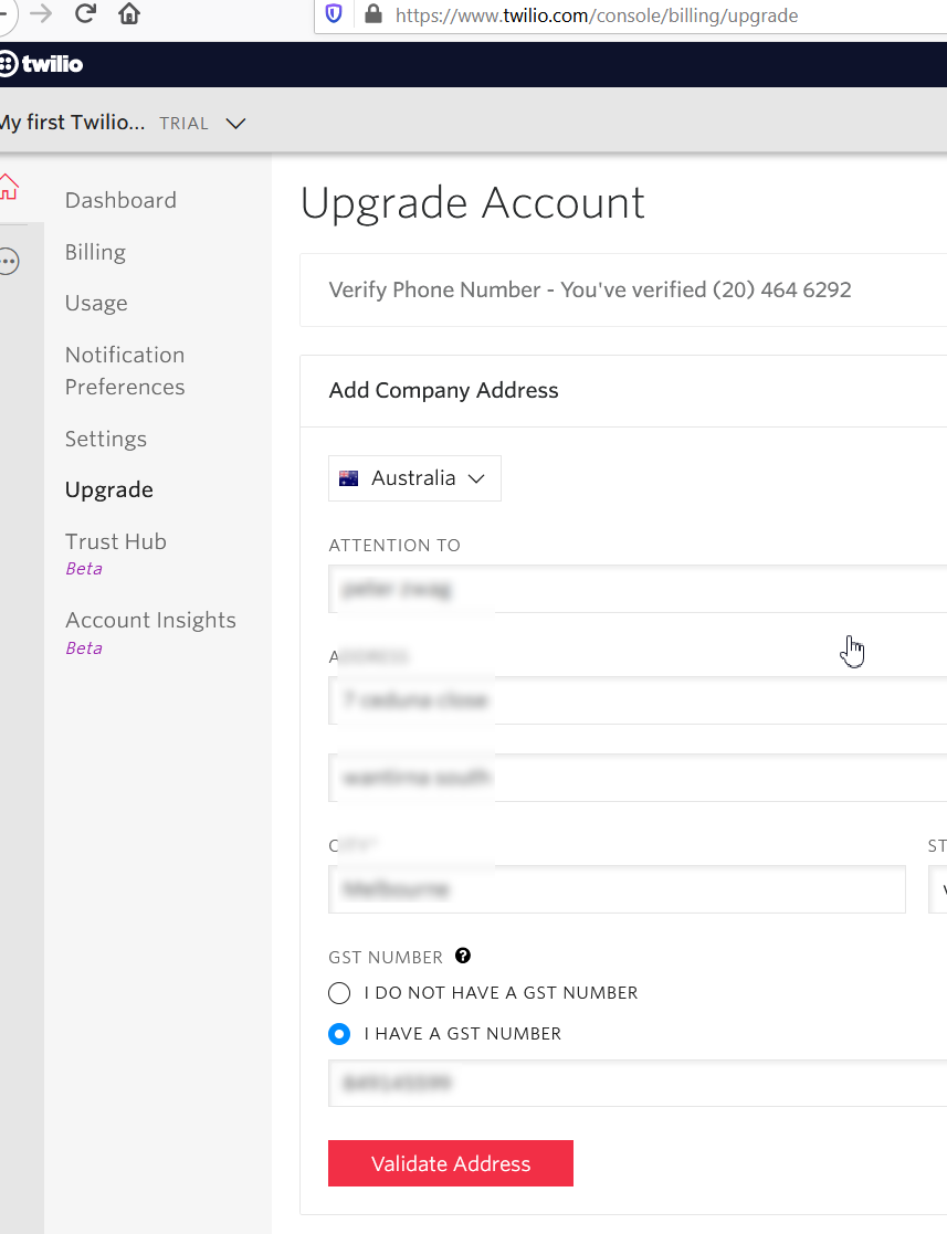Execution services & toolsAlertmonMonitoringSms account Topping up a trial account https://www.twilio.com/console/billing/upgrade GST number should be optional You need to enter billing address and company address Fill in the fields below. Its recommend to allow auto top ups