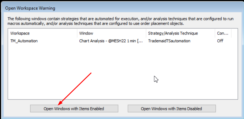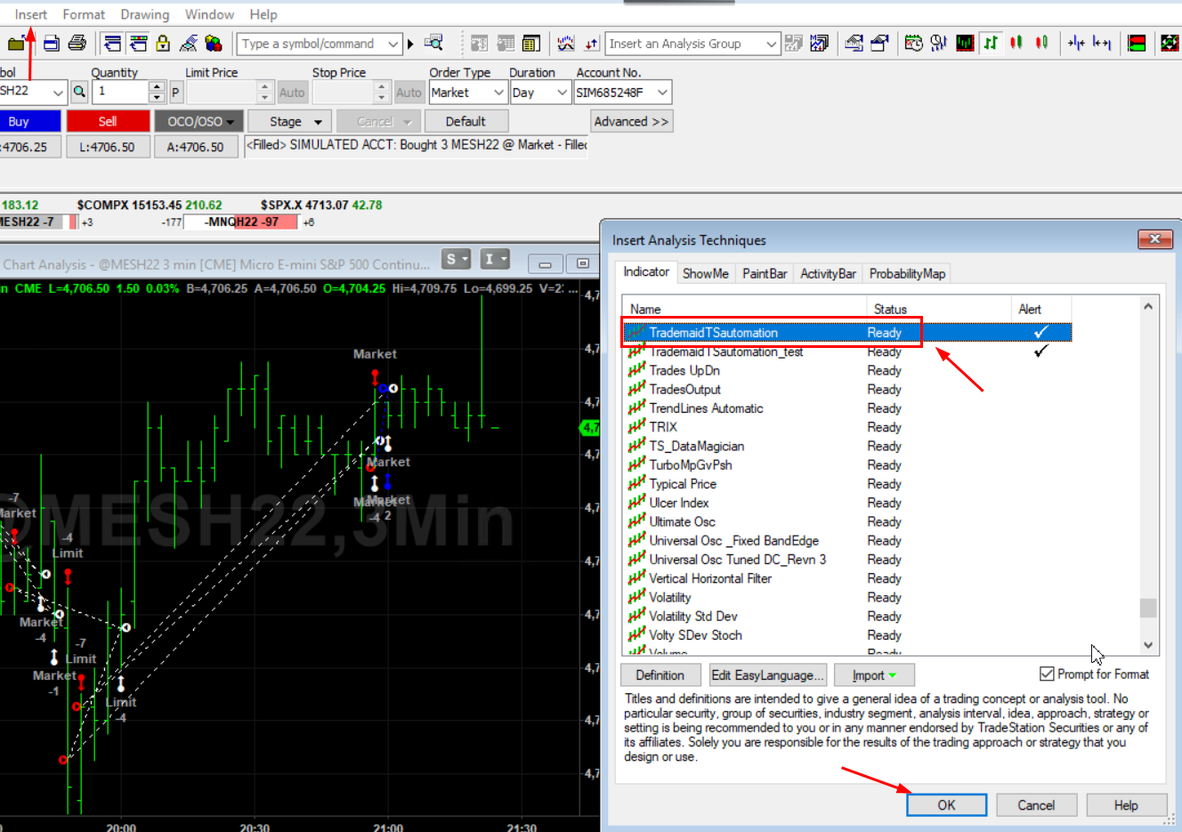 While its recommend for live trading to use continuous symbols, you will not see open orders on the chart if this is done. To learn / watch / experiment with TM automation, it would be best to have the chart being the symbol you are trading. IE @MESH22, NOT @MES